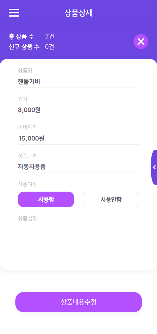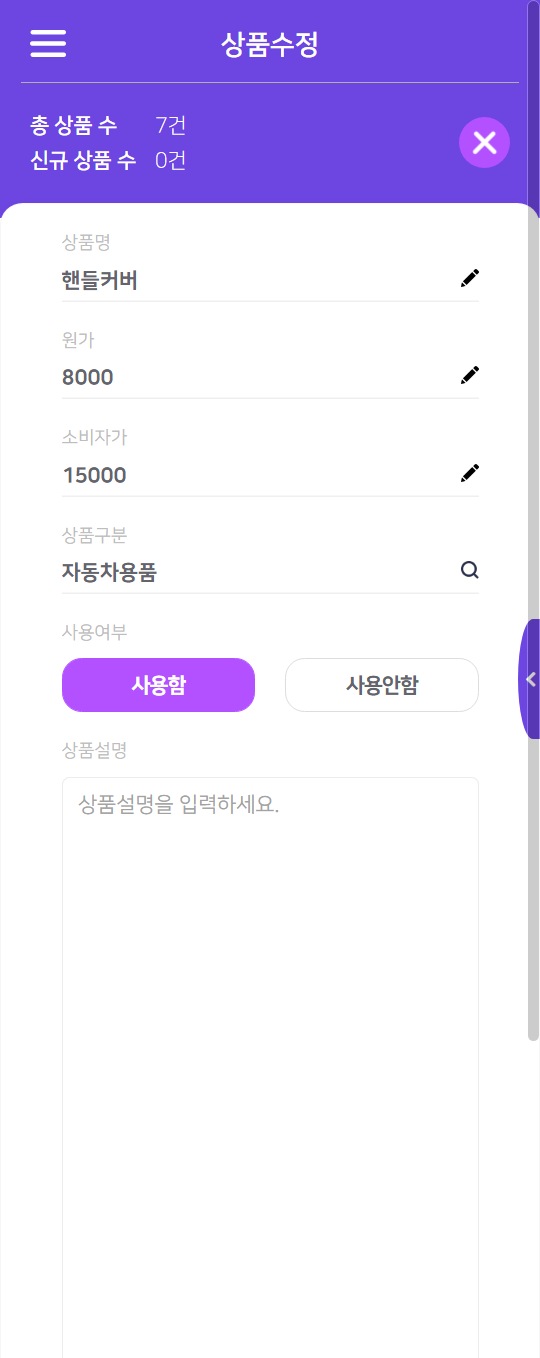 - 판매내용수정를 터치하면 상품내용 수정 페이지로 이동합니다.