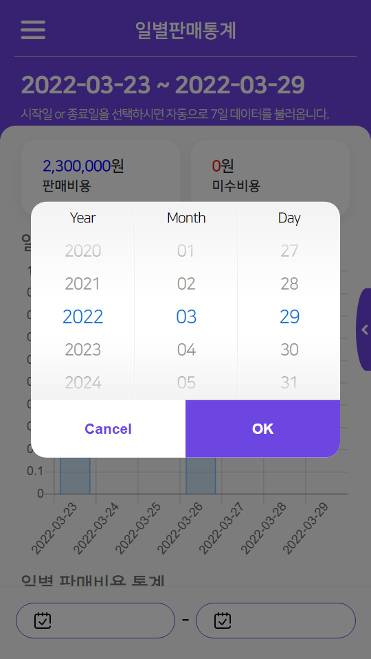 - 원하는 날짜를 선택 후 OK를 터치하면 해강 기간으로 데이터를 출력합니다.