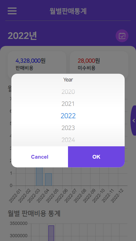 - 원하는 연도를 선택 후 OK를 터치하면 해당년도로 데이터를 출력합니다.